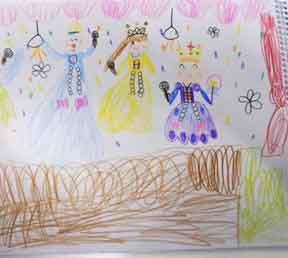 うえの絵は、3人のお姫様やお花、舞台や装飾が描かれています。この絵は、概念を描いています。われわれ大人は、子どもが、こうした絵が描けるようになると「絵が描けるようになった」と安心したりします。逆に、グルグル描きのような抽象的な絵ばかりをずっと描いていると、発達を心配したりします。