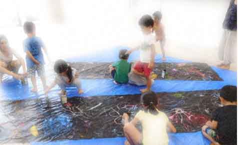アートは、個人の活動だけでなく、他者と共同で行うこともできます。子どもは、ひとりひとりが違うことを考えています。他の子どもといっしょに、ひとつの同じ作品に取り組んでいるときに、となりの子を見て、自分とは違う感性を発見します。そこには刺激や、新たな発想が生まれます。