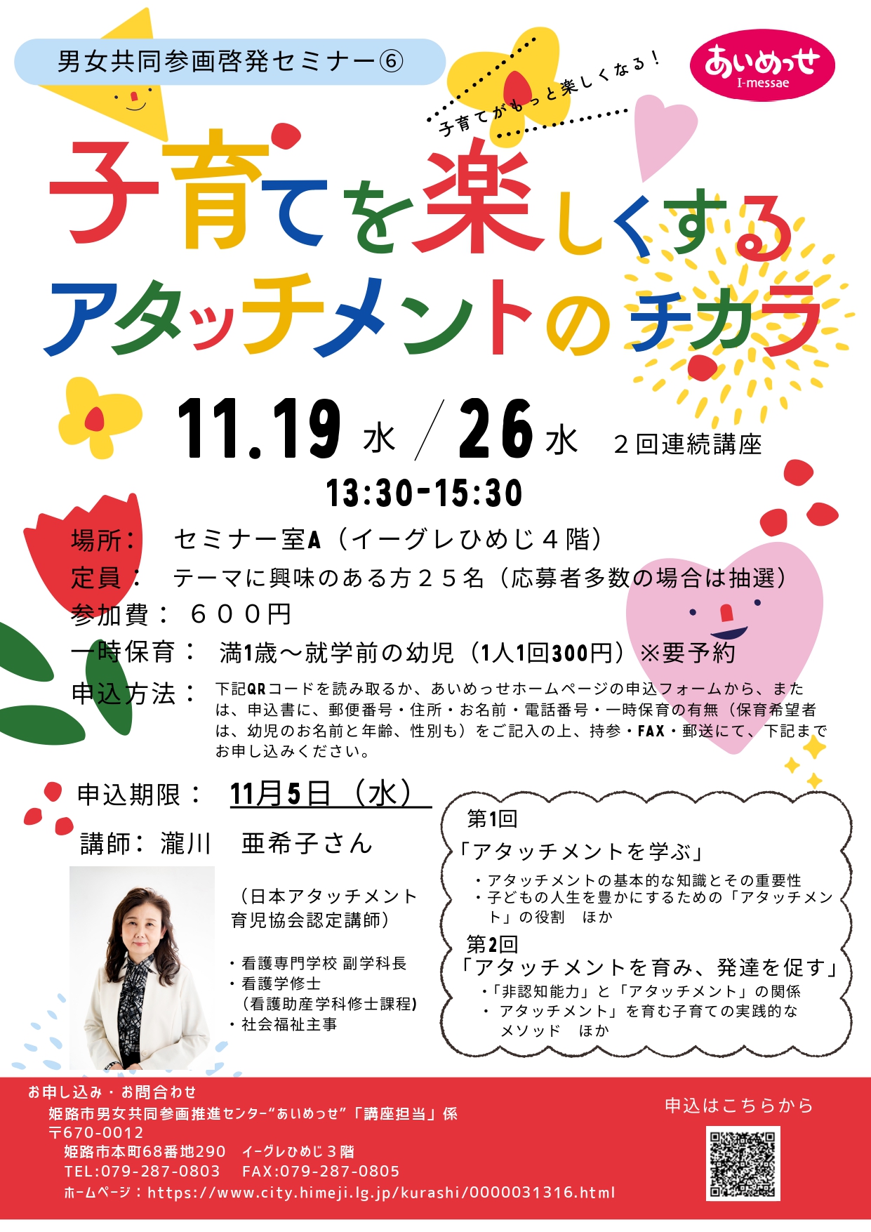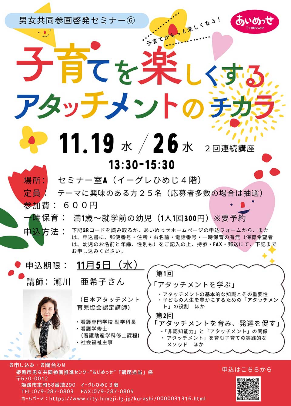 先日、11月19日(水)・26日(水)の2日間にわたり、当協会の認定講師 瀧川亜希子講師が、姫路市の男女共同参画啓発セミナーとして実施された「子育てを楽しくするアタッチメントのチカラ」に登壇いたしました。