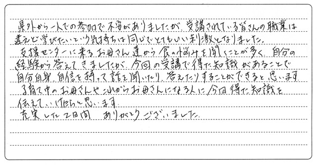 県外から一人での参加で不安がありましたが、受講されている皆さんの職業は違えど学びたいという気持ちは同じでとてもいい刺激となりました。支援センターに来るお母さん達から食の悩みを聞くことが多く、自分の経験から答えてきましたが、今回の受講で得た知識があることで自分自身、自信を持って話を聞いたり、答えたりすることができると思います。子育て中のお母さんや、これからお母さんになる人に今回得た知識を伝えていけたらと思います。充実した2日間、ありがとうございました。