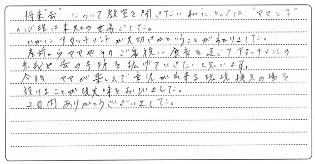 将来”歯”について教室を開きたい私にとっては”ママと子”の心理は未知の世界でした。いかにアタッチメントが大切かということがわかりました。産前からママやそのご家族に食育を通じてアタッチメントの意識や歯の予防を拡げていきたいと思います。今後、ママが楽しんで育児が出来る環境提供の場を設けることが現実味をおびました。2日間ありがとうございました。